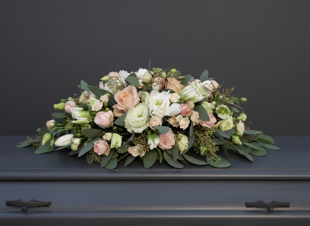 Popis zo stránky dodávateľa: Aranžmán je vytvorený zo živých kvetov v sezónnom mixe – jednotlivé druhy sa môžu mierne líšiť podľa aktuálnej dostupnosti, vždy však s dôrazom na zachovanie pastelovej farebnosti, elegancie a harmonického celku. Je určený na uloženie na truhlu a svojím mäkkým, prirodzeným vzhľadom prináša pokoj a ticho v ťažkých chvíľach rozlúčky.