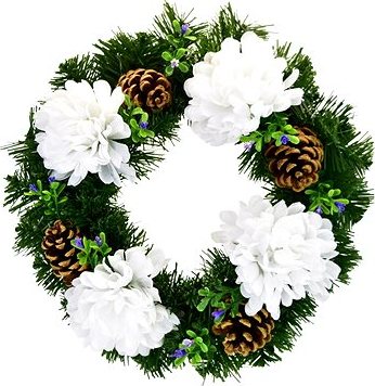 Umelé kvety na hrob – DOMMIO Dušičkový veniec s bielymi chryzantémami, 30 cm