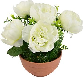 Umelé kvety na hrob – DOMMIO Pivonky biele 6 kvetov v terakotovej miske, priemer 26/26 cm