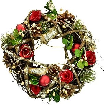 Veniec DOMMIO Vianočný veniec – prútený s červenými kvietkami a šiškami, 25 cm: