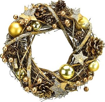 Umelé kvety na hrob – DOMMIO Vianočný veniec – prútený so zlatými guľôčkami, 24 cm